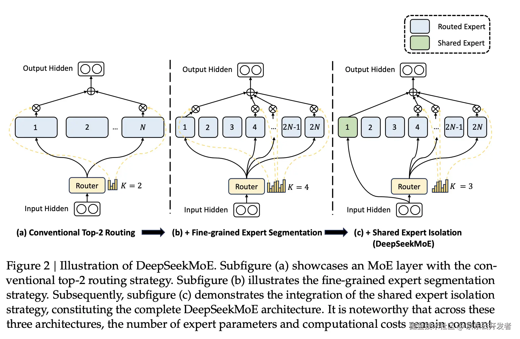 DeepSeekMoE对比传统的混合专家模型(Mixture of Experts, MoE),多了2个核心优化: