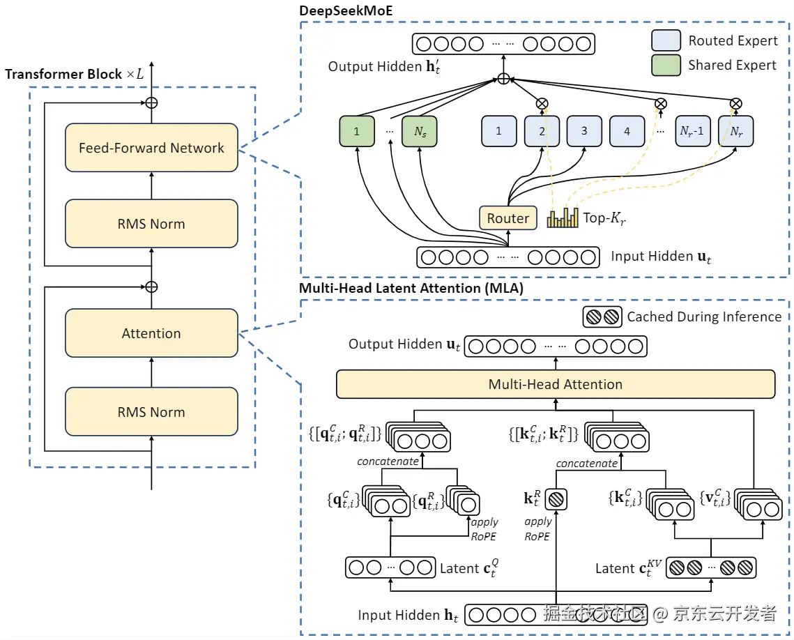 整体结构如下图:在注意力机制部分采用MLA,在前馈网络(FFN)部分采用DeepSeekMoE的结构.