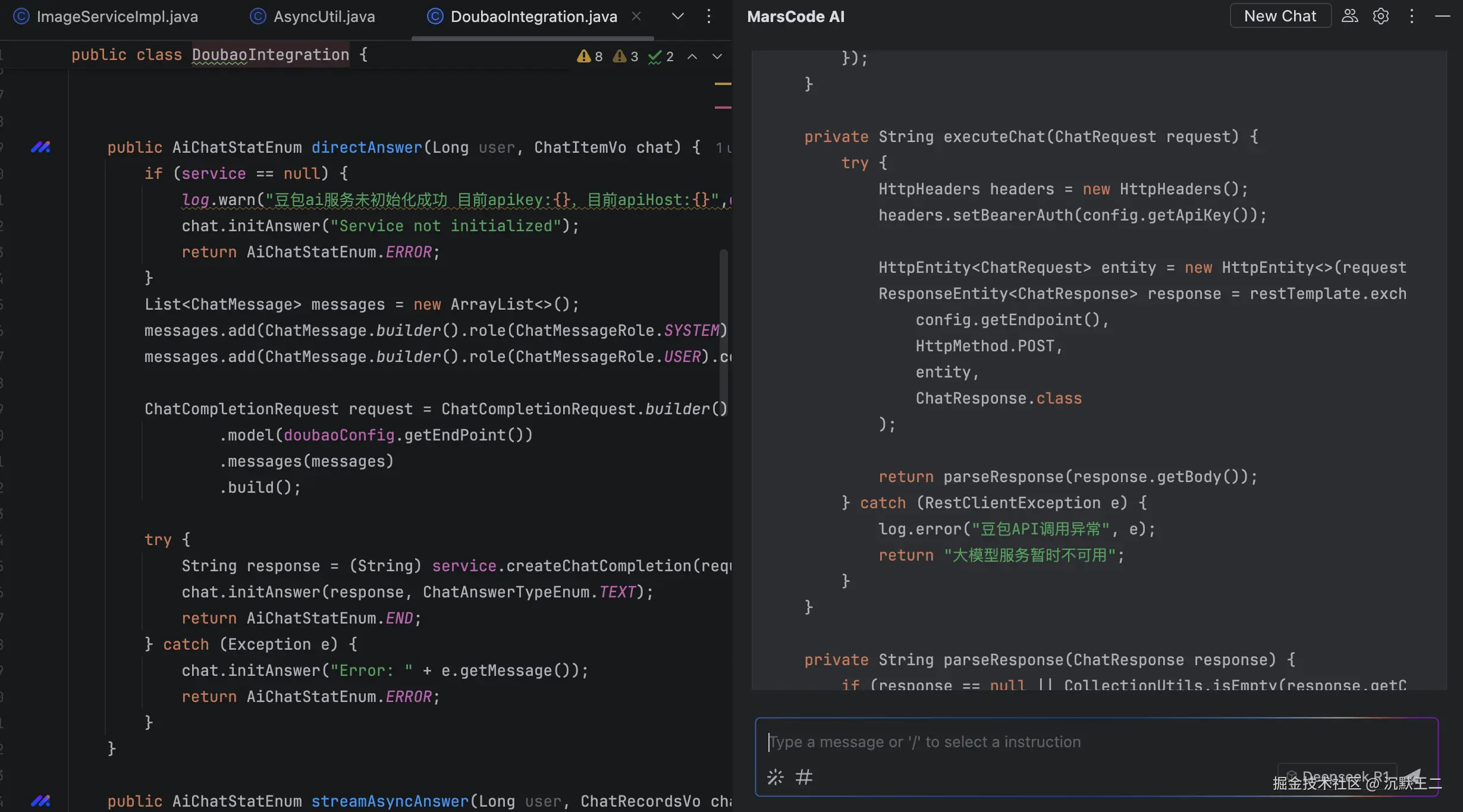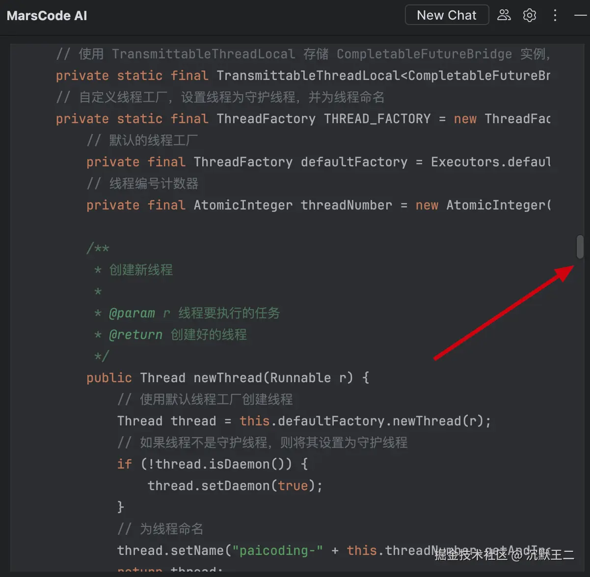 在编辑区打开技术派的异步类 AsyncUtil,MarsCode 就能够把这个类加载到当前的上下文聊天环境中。