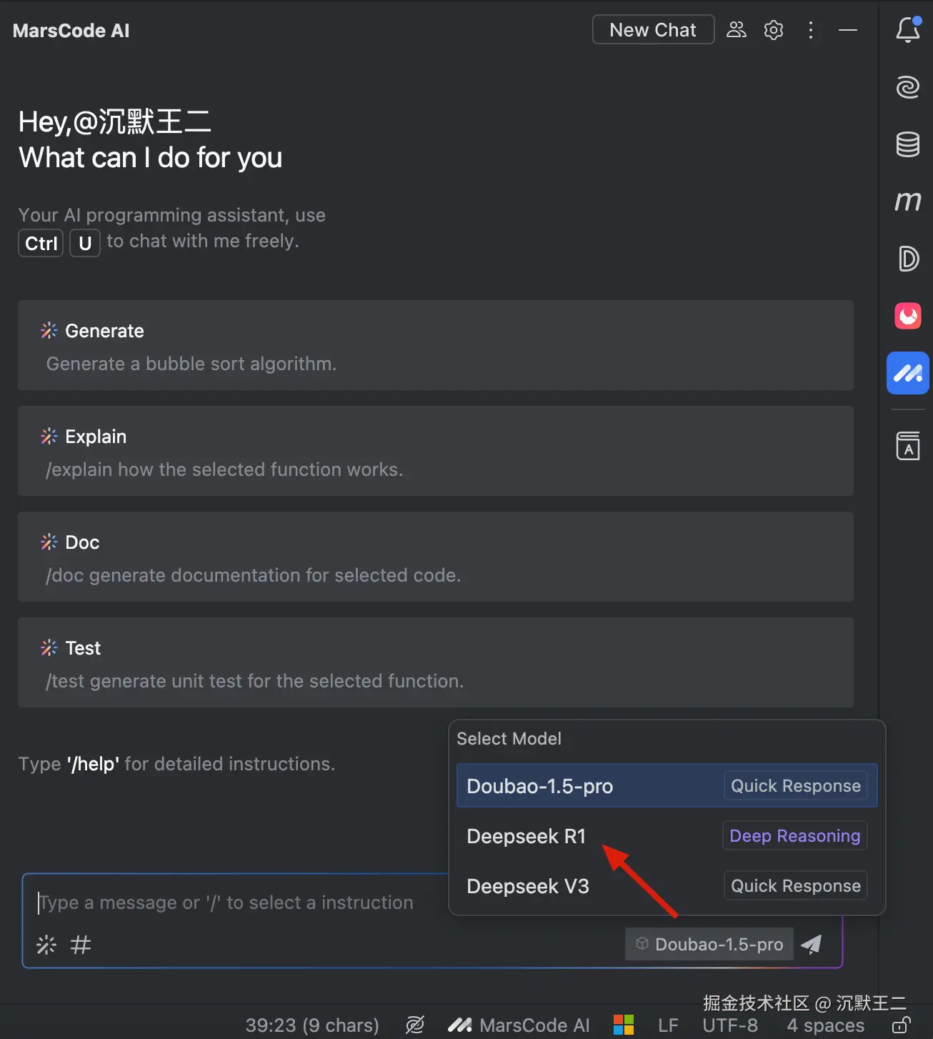 点击右下角的下拉菜单,还可以在 Doubao-1.5-pro、DeepSeek-R1 和 DeepSeek-V3 模型中自由切换。