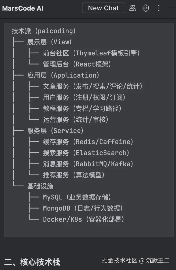 很快,AI 就会给出一个清晰的分析,先是以树形结构展示技术派的核心架构分层。