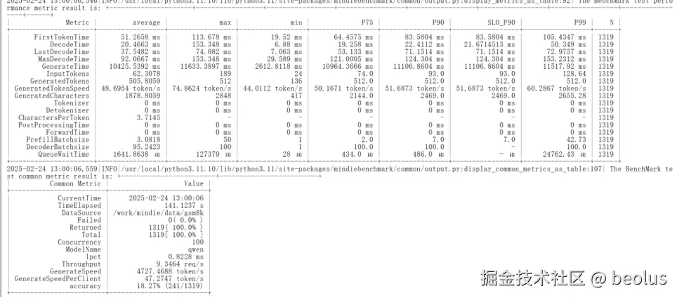 benchmark --DatasetPath "$datasetPath" --DatasetType "gsm8k" --ModelName qwen --ModelPath "$weightPath" --TestType client --Http http://127.0.0.1:1025 --ManagementHttp http://127.0.0.2:1026 --Concurrency 100 --TaskKind stream --Tokenizer True --MaxOutputLen 512