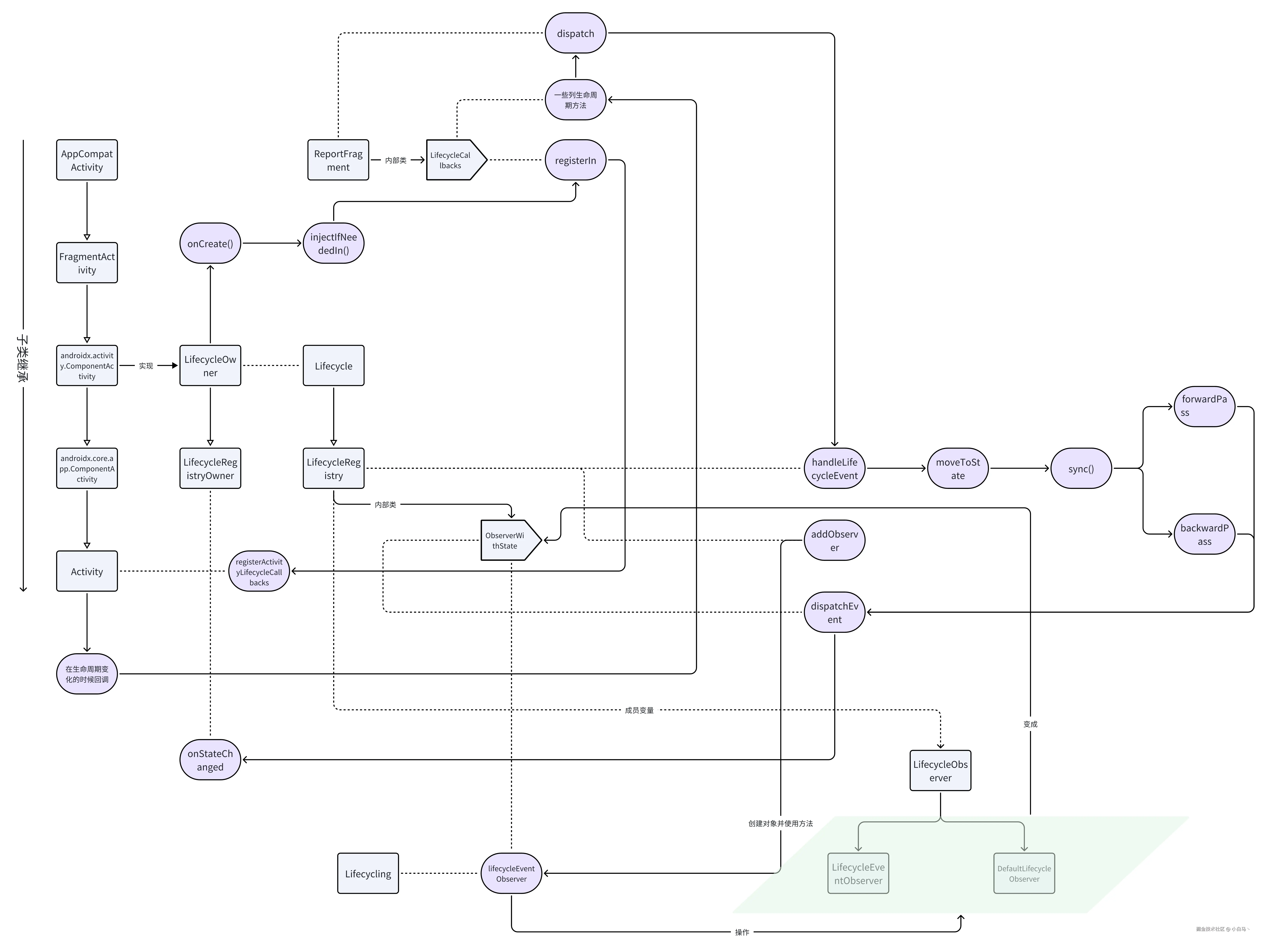 activity 会持有一个 lifecycle,要添加一个观察者我们只需要调用addObserver 方法。但是上面注册的时候是有两个接口供我们选用,但是无论是哪种,最终都会被封装成ObserverWithState,这个类我们之前也见过,是它持有了dispatchEvent方法。