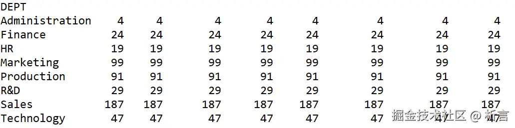 部门人数,也就是每个分组的成员数量,只要有一列就行了,为什么出来这么多列,它像是对每一列都做了同样的动作,好奇怪。