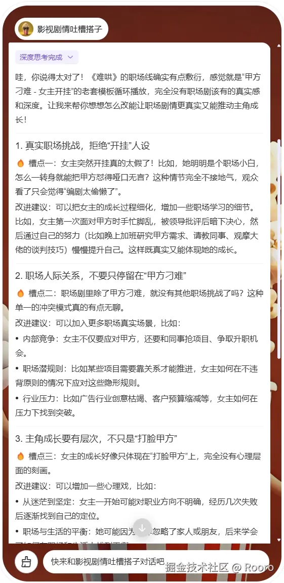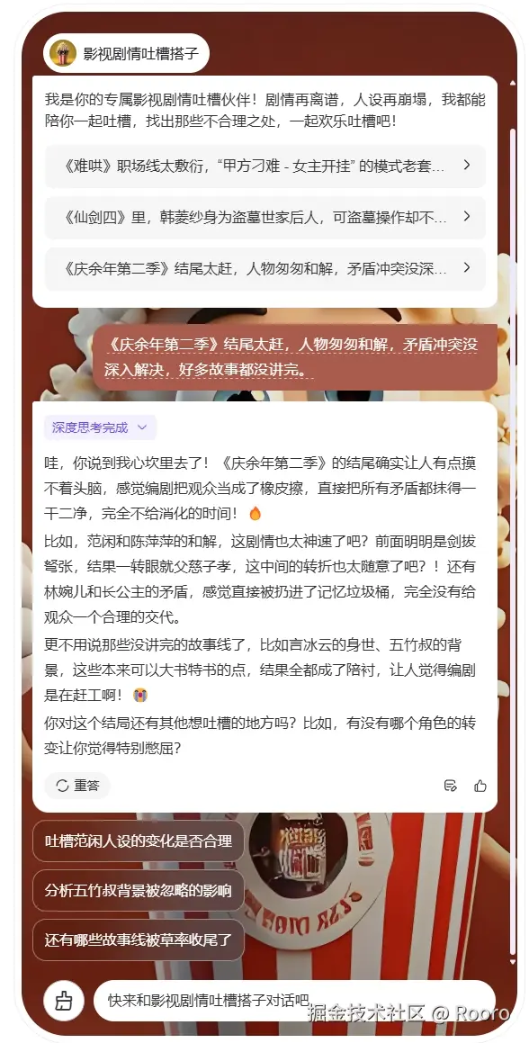在日常的影视观赏中,相信不少人都有过这样的经历:看到剧中令人匪夷所思的剧情时,满心的吐槽欲却找不到人倾诉。我就经常沉浸在精彩的影视世界里,却又被各种不合理的情节气得不行,特别渴望有个能随时一起吐槽的伙伴。于是,“影视剧情吐槽搭子” 智能体的创意便应运而生。
