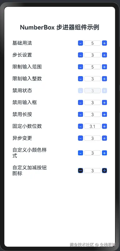 NumberBox步进器组件的步长(step)是指每次点击增加或减少按钮时,数值变化的幅度。通过合理设置步长,可以满足不同场景下的数值调整需求。本文将详细介绍如何在HarmonyOS NEXT中设置和使用NumberBox步进器的步长功能。