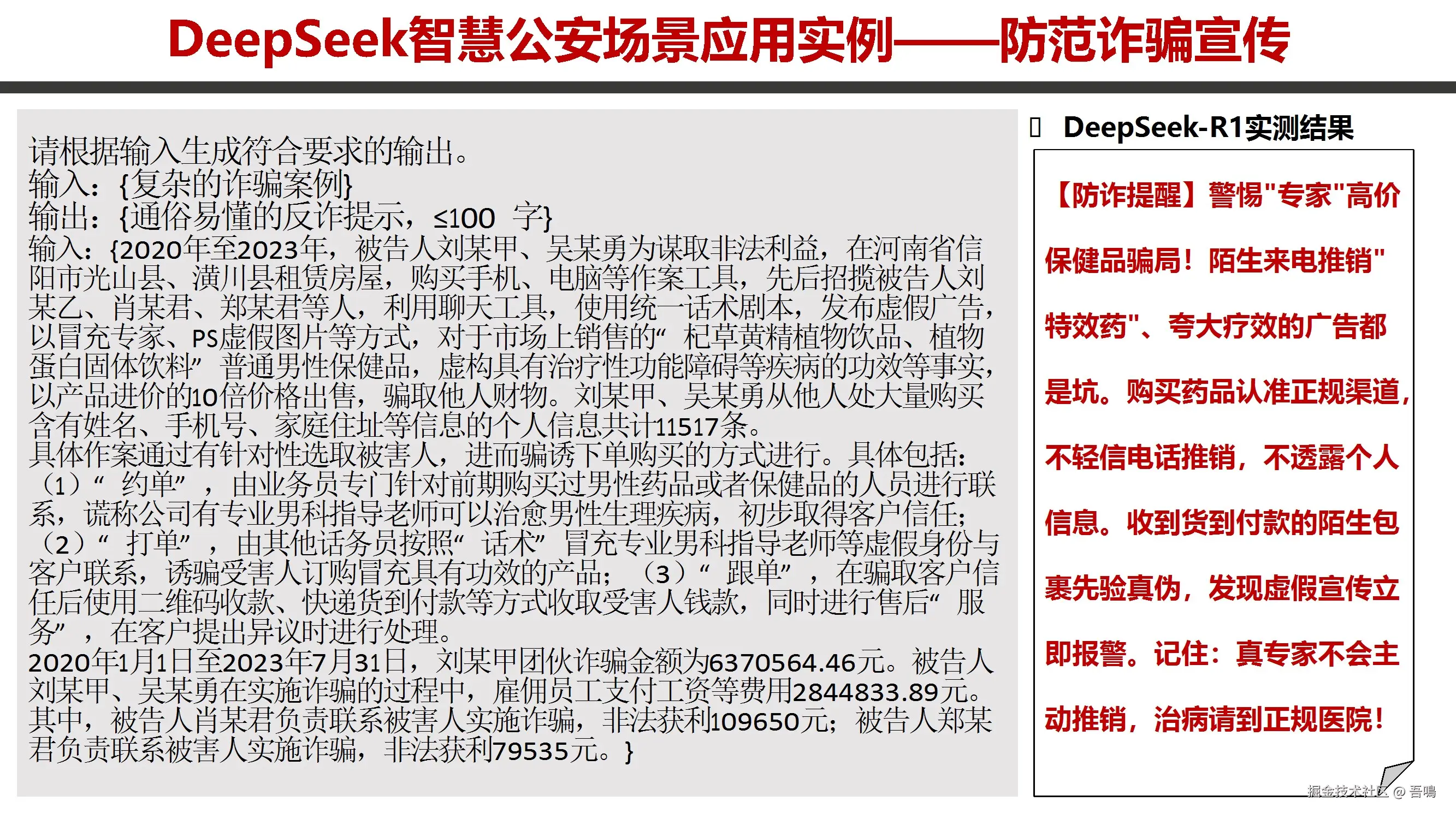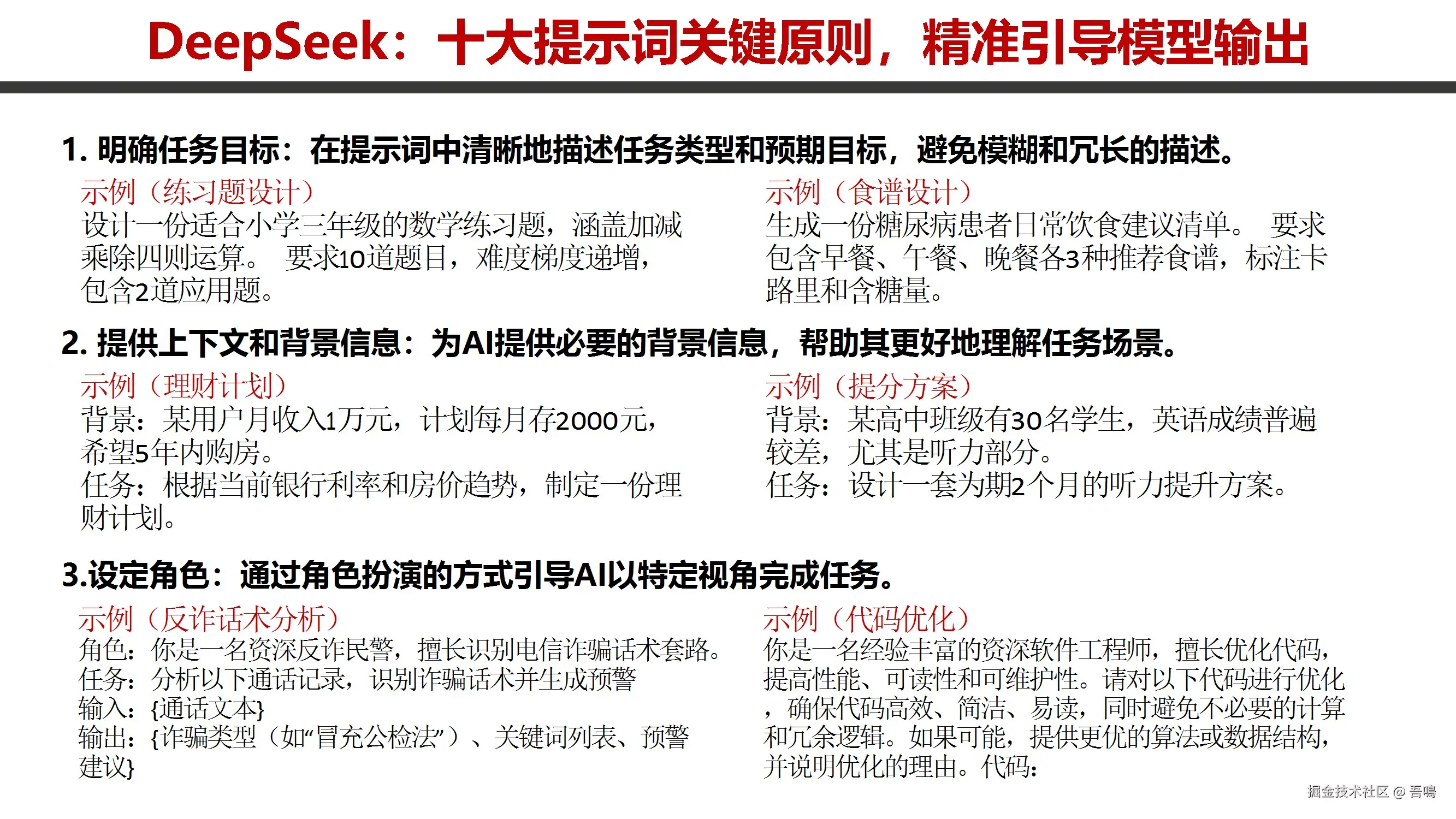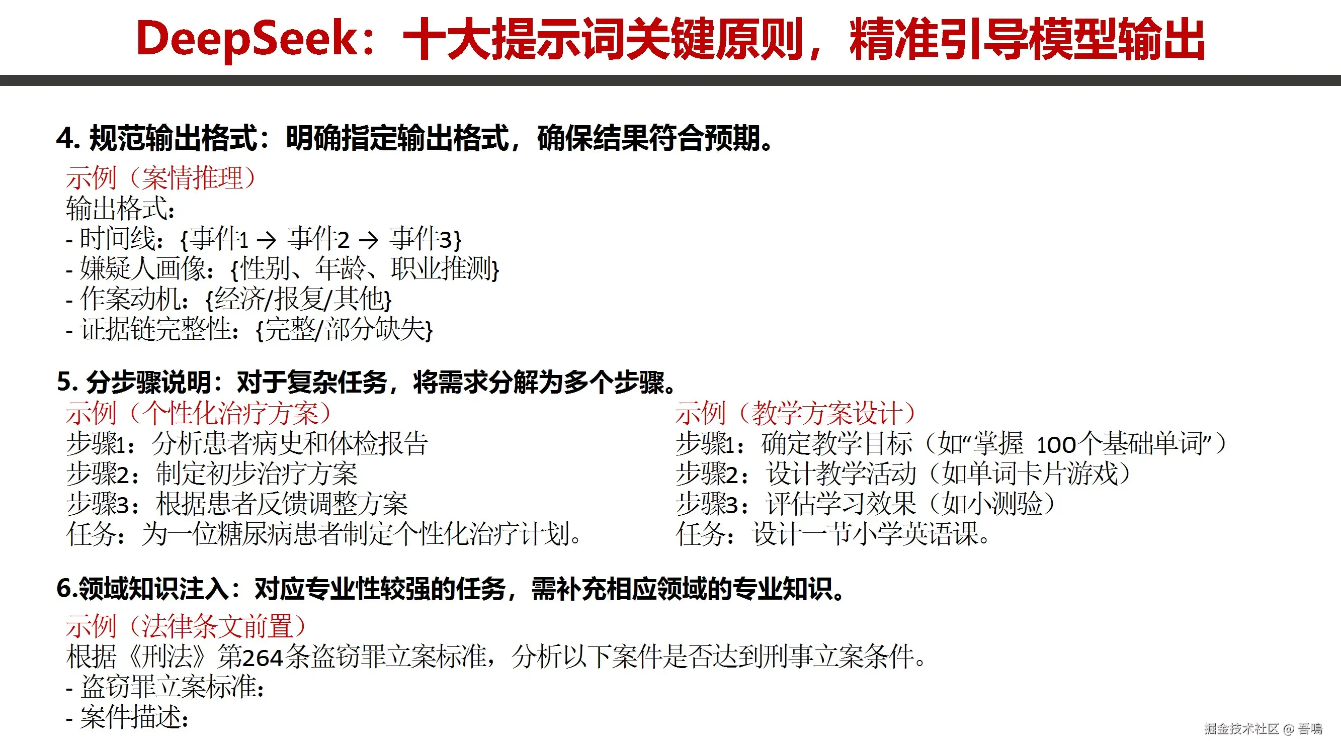 重点围绕“十大提示词关键原则”,指导用户精准引导模型输出,包括明确任务目标、提供上下文、设定角色、规范格式、分步骤说明等。通过多个行业场景实例(公安、税务、政务、教育、医疗、农业、办公等)展示实际应用,涵盖反诈宣传、案情通报、税收合规、户籍管理、代码优化、术后康复指导等任务。此外,包含翻译场景(俚语、古诗)和跨学科研究(如比较文学、中东地缘分析),强调结构化输出与领域知识注入。