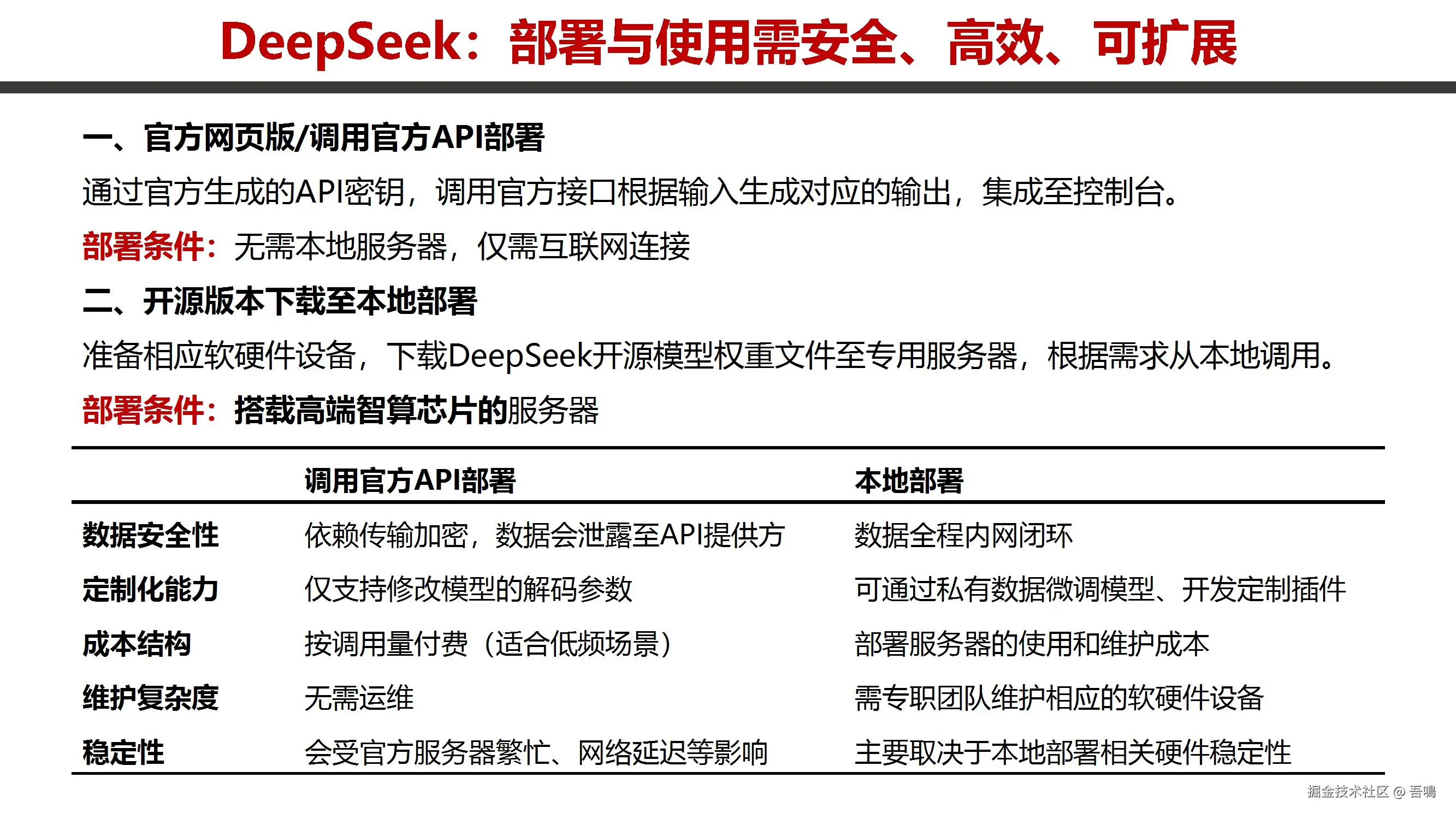 主要介绍两种部署方式:通过官方API调用和本地服务器部署。API部署依赖互联网连接,成本低但数据可能外泄;本地部署需高端硬件(如多卡GPU服务器),支持私有数据微调和定制插件,数据闭环但运维复杂。详细流程包括模型权重下载、依赖安装、多服务器配置(如全量版、蒸馏版、量化版部署),并对比不同模型对硬件的要求(如显卡数量)。此外,提供可选UI界面搭建框架(如Open WebUI、LM Studio)和多端适配开发建议。