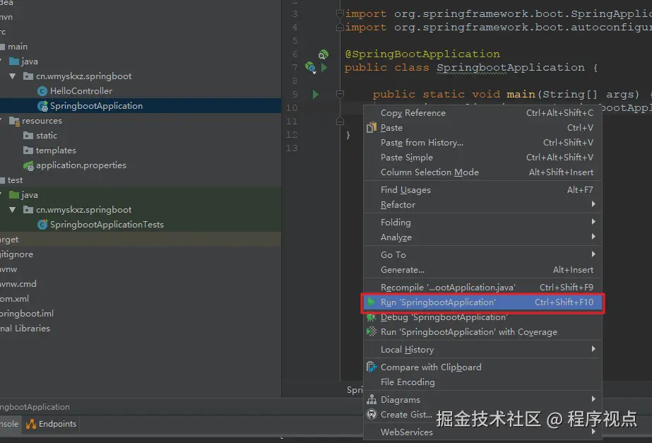 我们回到 SpringbootApplication 这个类中,然后右键点击运行: