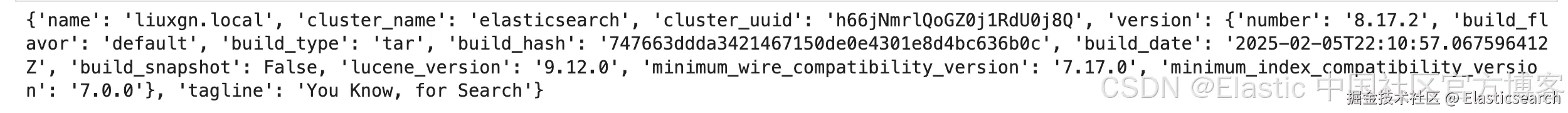 当我们安装的时候,选择 Elastic Stack 8.x 的文章来进行安装。在本展示中,我们将使用 Elastic Stack 8.17.2 来进行展示。当我们首次运行 Elasticsearch 时,我们可以看到如下的界面: