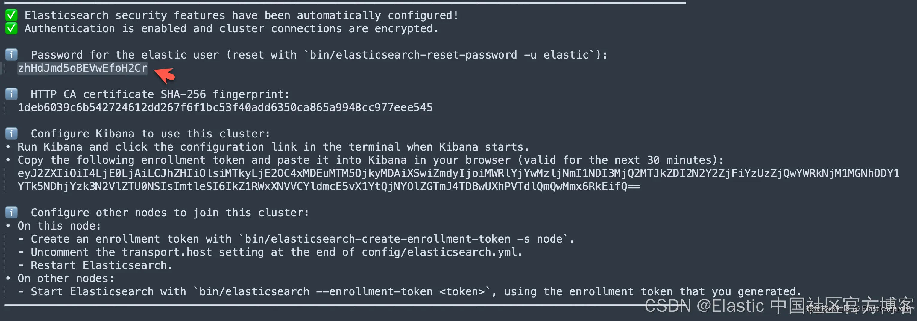 请记下上面的 elastic 超级用户的密码,以备在下面进行使用。