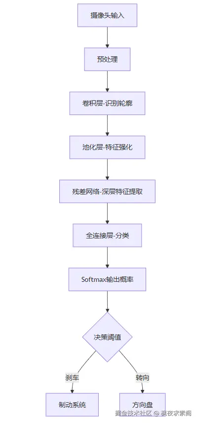 - Softmax输出概率 → 给"刹车"和"转向"打分(比如刹车90%,转向10%表示应该紧急刹车)