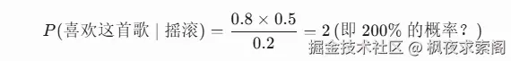 • 分子的含义:综合这两点,这首歌既符合你的偏好类型(摇滚),又有较高的被你随机喜欢的概率。 - 分母: