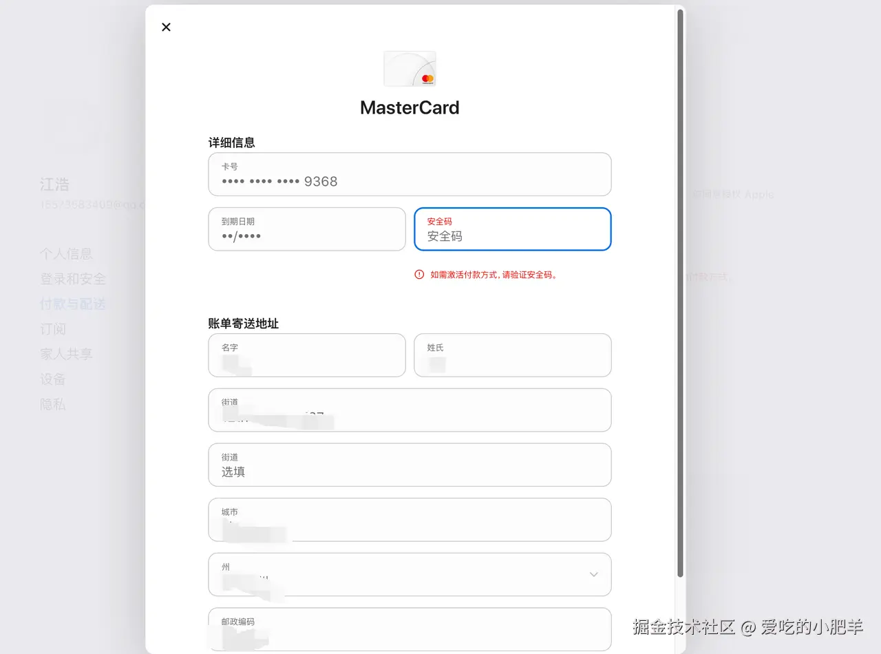 在付款方式页面,按照屏幕提示,准确海外支付卡信息,包括卡号、有效期、安全码(CVV)以及账单地址。请注意,此处必须绑定有效的海外支付卡,如果你没有,在文章的后面也有详细的教程。