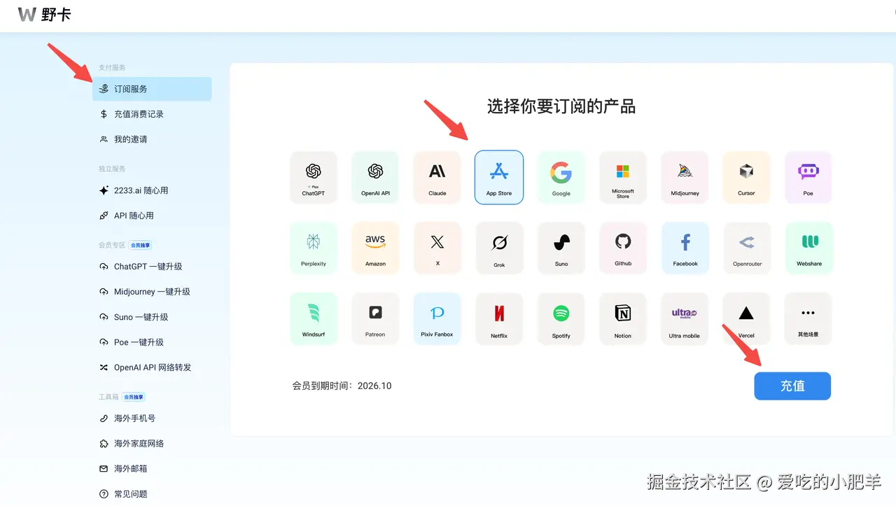 点击「订阅服务」-「App Store」-「充值」按钮,进入到卡片页面。