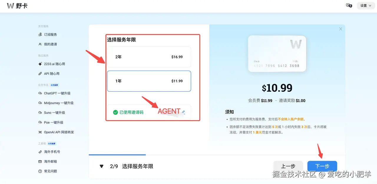 随后,根据自己的需求,选择会员的使用年限,在这一步别忘记填写邀请码,会减少一美金的费用。