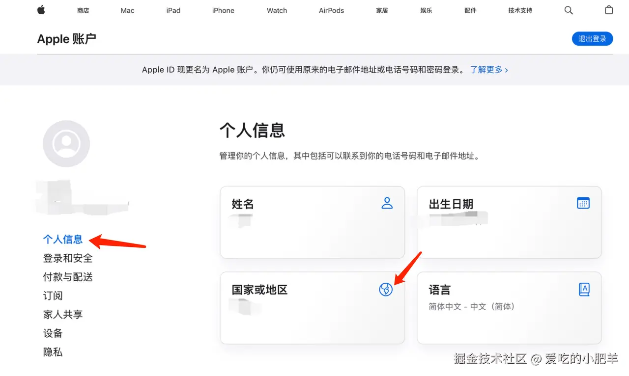 进入“个人信息”页面,然后选择“国家或地区”选项。