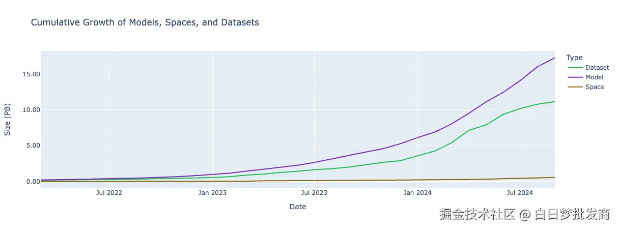 下图展示了 Hub 上各类仓库 (模型、数据集和 Spaces) 中 LFS 存储容量在 2022 年 3 月至 2024 年 9 月期间的增长趋势: