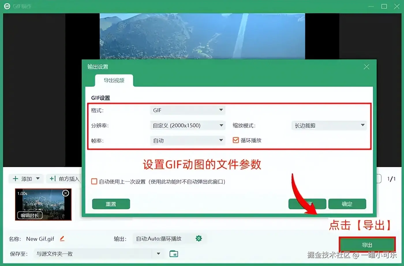 第三步:在弹出来的GIF输出设置中,设置GIF动图的文件参数,然后点击【导出】即可。