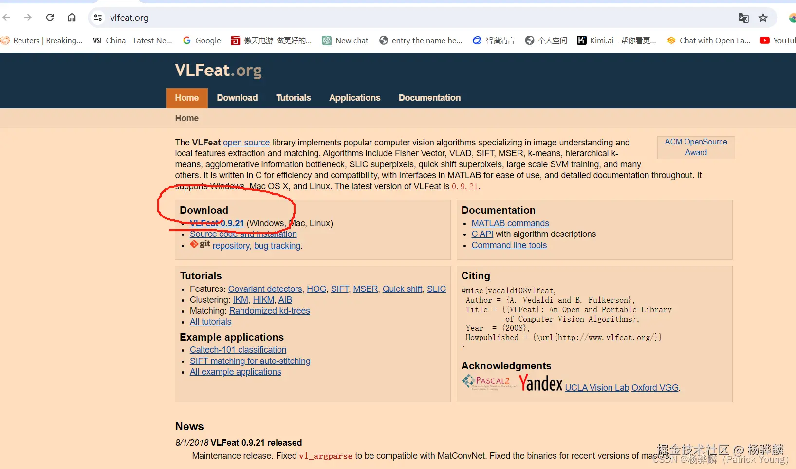打开下面网址进行下载VLFeat - Homehttps://www.vlfeat.org/