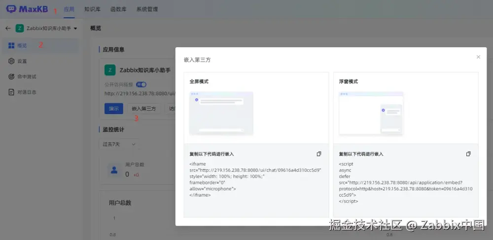 您还可以将助手添加到Zabbix前端,以便在页面上随时调用。具体步骤为:进入“应用” -> “Zabbix知识库小助手” -> “概览” -> “嵌入第三方”。