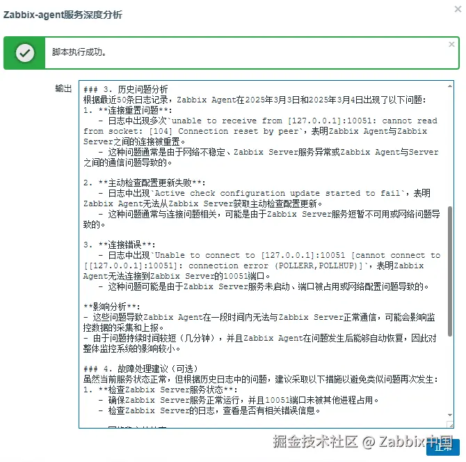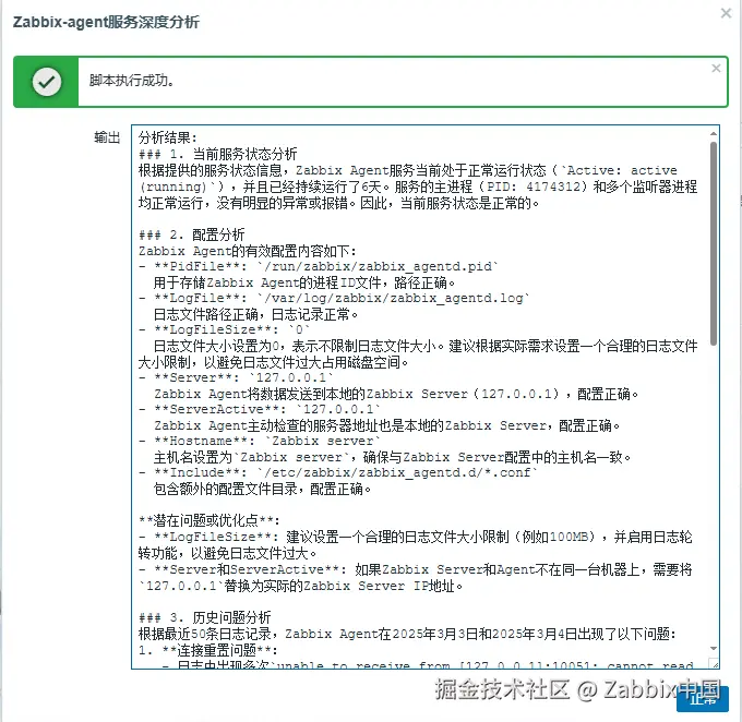 通过结合Zabbix前端一键脚本调用系统服务状态、配置文件、日志文件,可以实现针对某项特定服务的深度巡检分析,效果展示如下: