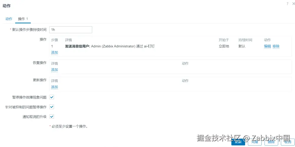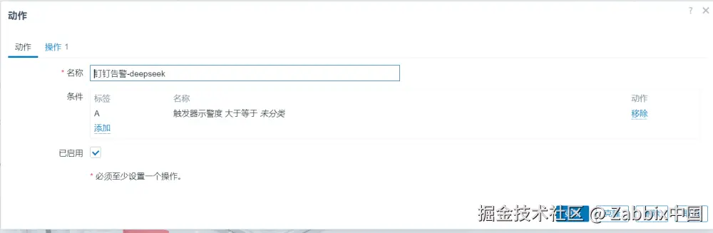 进入告警-动作-触发器动作-创建动作,名称可填写钉钉告警-deepseek,条件按需要勾选