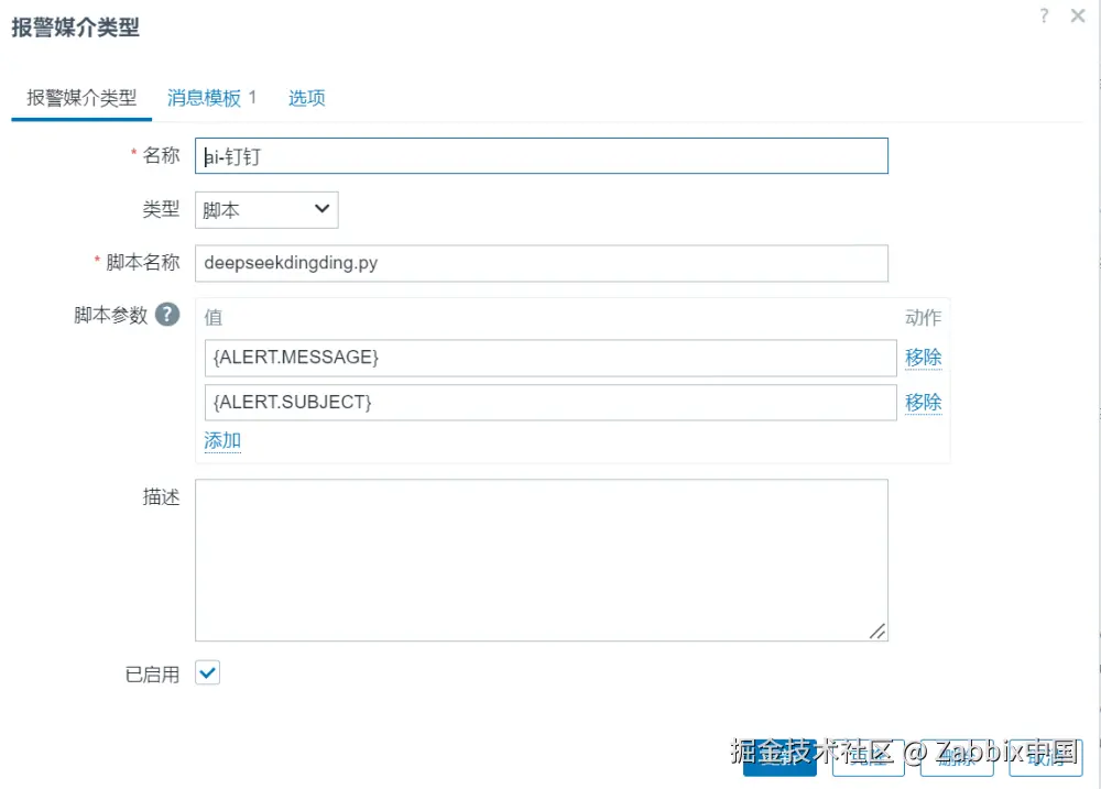 名称 ai-钉钉类型 脚本脚本名称 deepseekdingding.py脚本参数{ALERT.MESSAGE}{ALERT.SUBJECT}