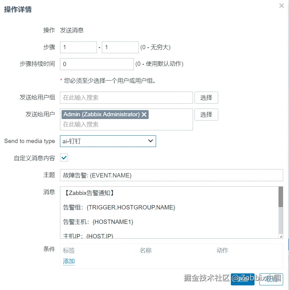 Send to media type ai-钉钉主题 故障告警: {EVENT.NAME}消息【Zabbix告警通知】告警组:{TRIGGER.HOSTGROUP.NAME}告警主机:{HOSTNAME1} 主机IP:{HOST.IP}告警时间:{EVENT.DATE} {EVENT.TIME}警报等级:{TRIGGER.SEVERITY}问题信息:{TRIGGER.NAME}事件ID: {EVENT.ID}