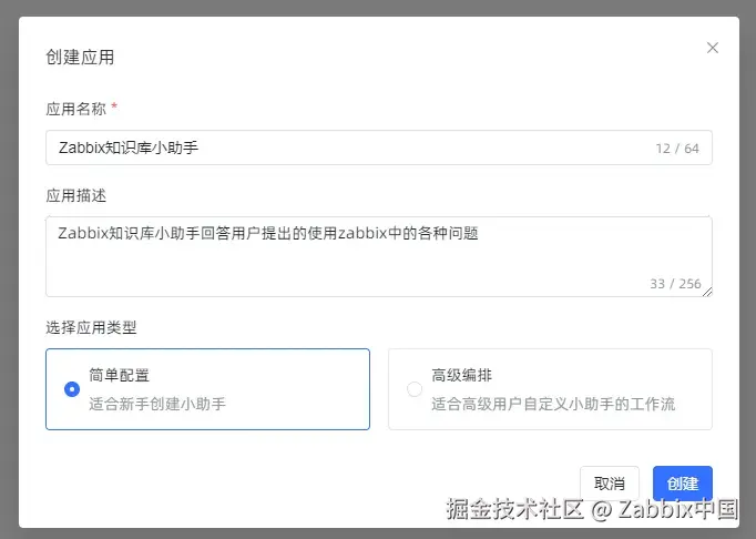 随后,选择“应用”并创建新应用。输入自定义名称和描述后,选择“简单配置”即可快速完成设置。如果需要更复杂的流程,您也可以进行高级编排,但本文不再展开讨论这部分内容。