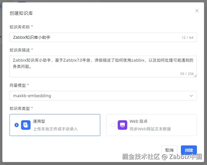 注意创建知识库时您可以选择两种类型:通用型和Web站点型。