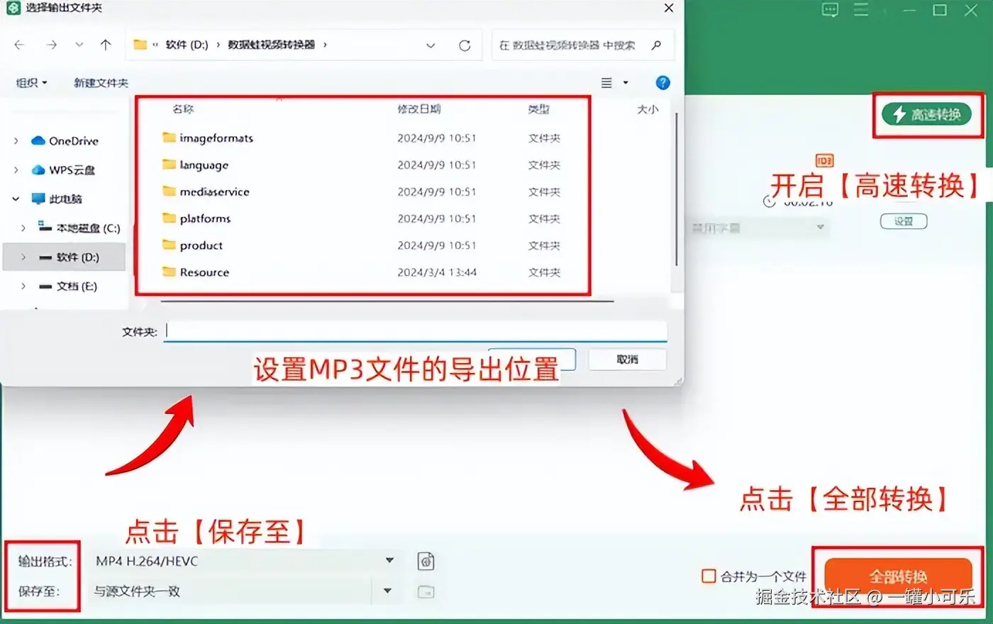 步骤3:开启【高速转换】,点击【保存至】设置MP3文件的导出位置,最后点击【全部转换】即可。
