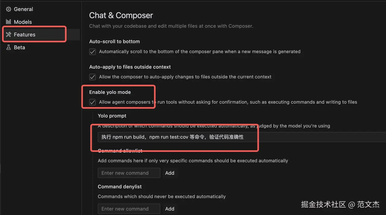 - 开启 cursor yolo 模式(要求 0.43 以上版本),这是一个强大的 AI Agent,能自行调用各类工具(eslint/ts/vitest 等)判断生成代码的合法性;