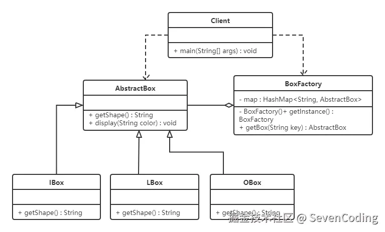 提供了一个工厂类(BoxFactory),用来管理享元对象(也就是AbstractBox子类对象),该工厂类对象只需要一个,所以可以使用单例模式。并给工厂类提供一个获取形状的方法。