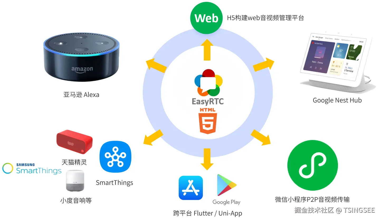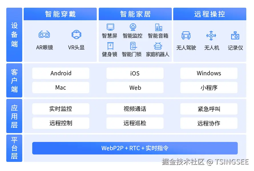 用户可以使用手机或其他终端设备与家中的智能摄像头、智能门锁、智能音箱等设备进行实时音视频通信,实现远程控制和安防监控。