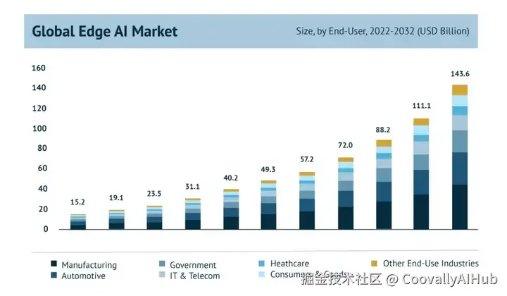 根据Market.US的研究,全球边缘人工智能市场规模预计将到2032年超过1400亿美元,较2023年的191亿美元大幅增长。这意味着九年间的复合年增长率 (CAGR) 接近 26%。而Precedence Research的数据则显示,边缘计算市场在2032年可能达到3.61万亿美元(CAGR 30.4%)。这些差异反映了不同研究机构对“边缘”定义的边界划分,但共同趋势是明确的:算力下沉与场景化部署已成为不可逆的潮流。