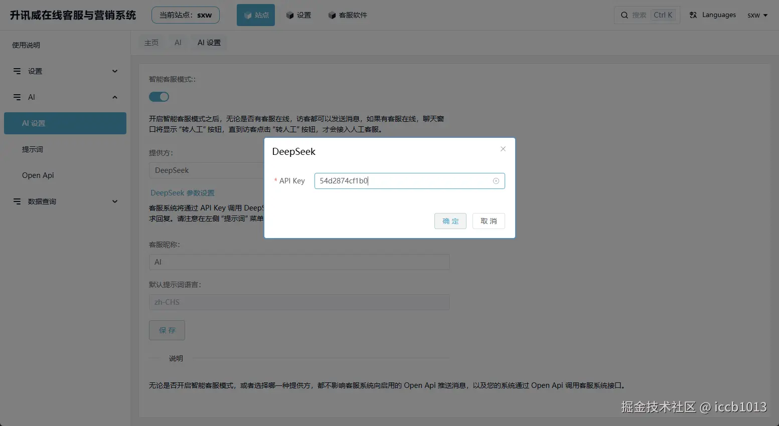 其实,我们只需要将 API key 填写到客服系统 Web 管理后台 AI 设置 中的 DeepSeek 参数设置即可。因为客服系统后台已经完成了相关的接口调用开发。