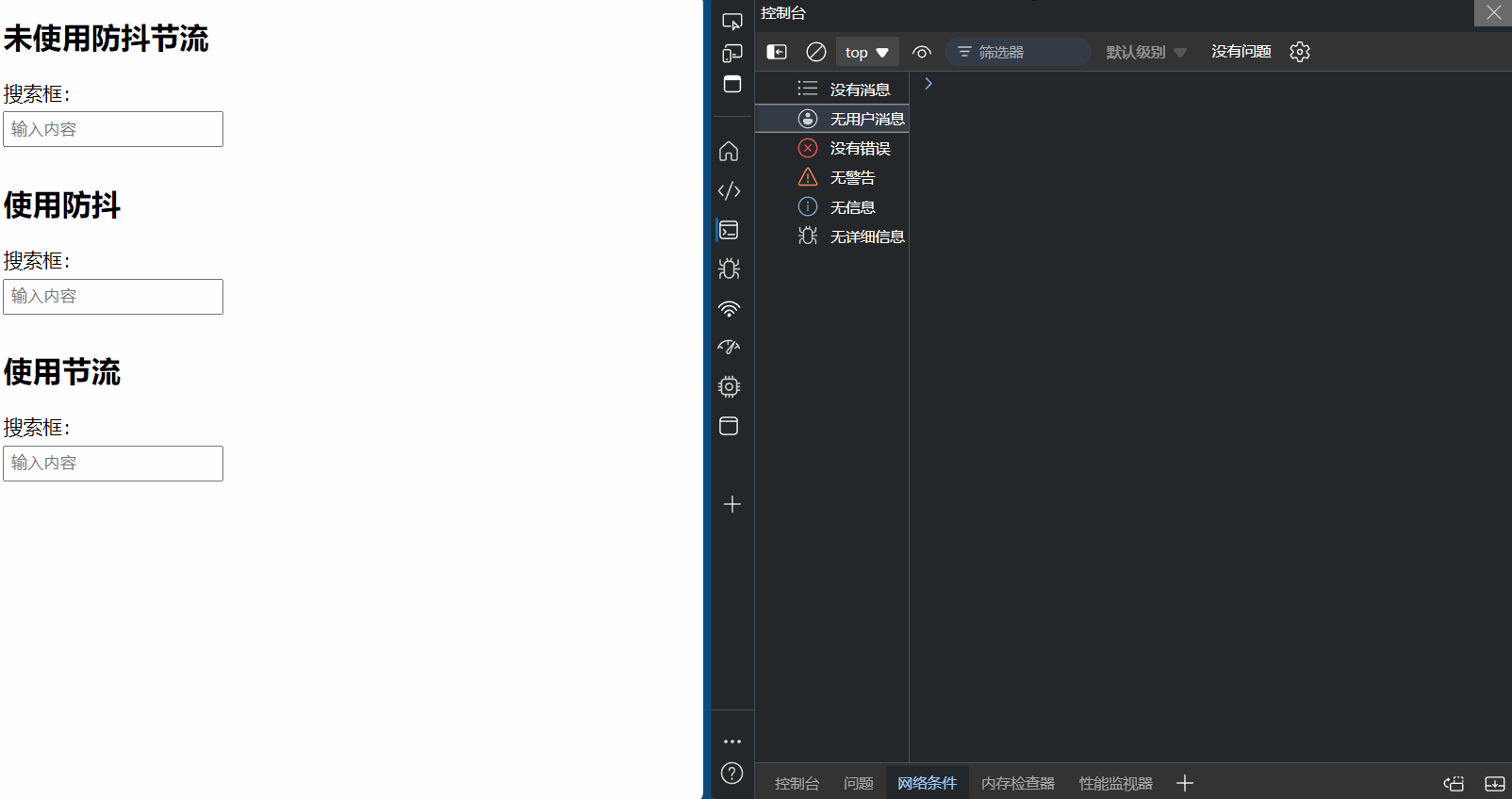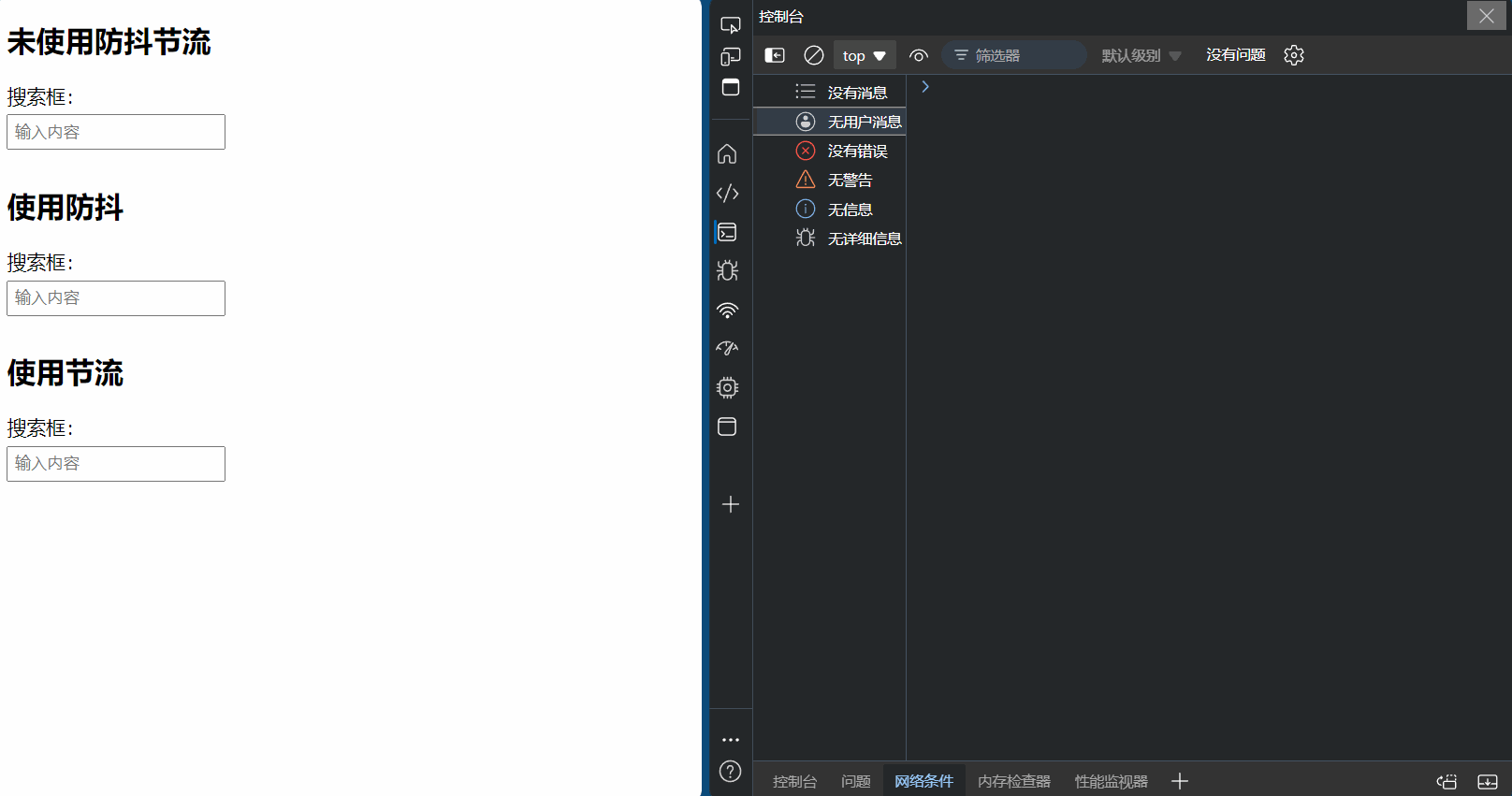 console.log("未使用防抖节流,触发搜索请求,输入内容为:", this.value);