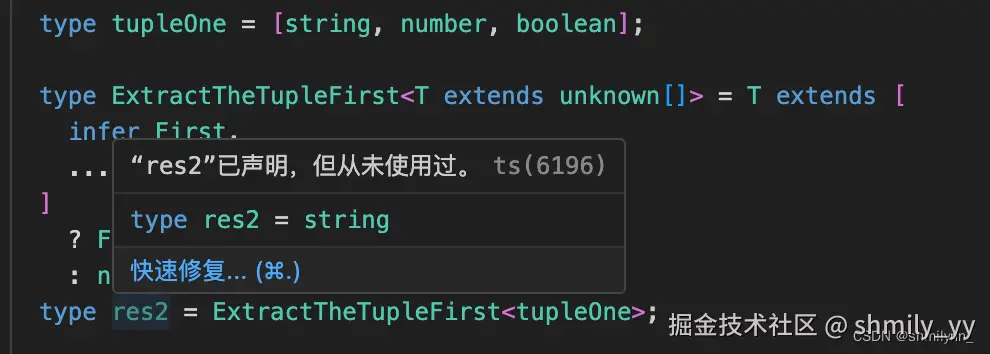 然后编写了一个工具函数 ExtractTheTupleFirst ,它接受一个泛型T作为参数,并对T约束为一个 unknow 的数组类型,
