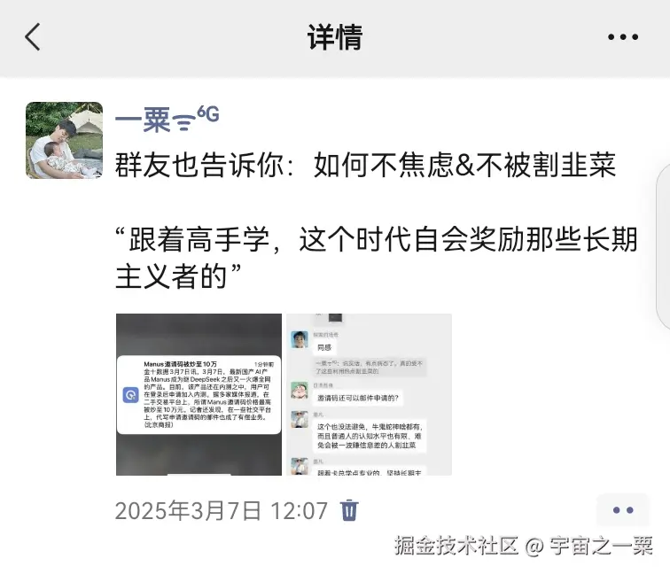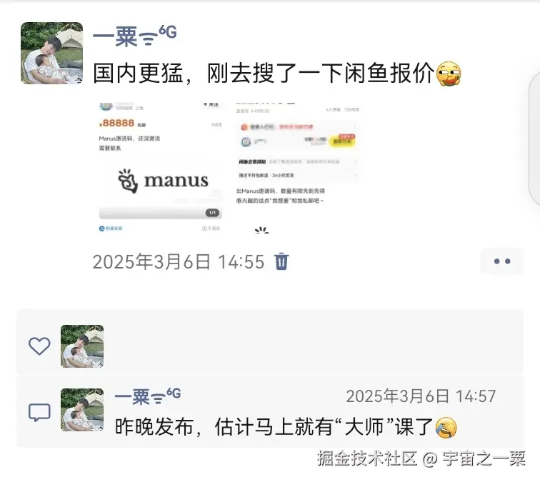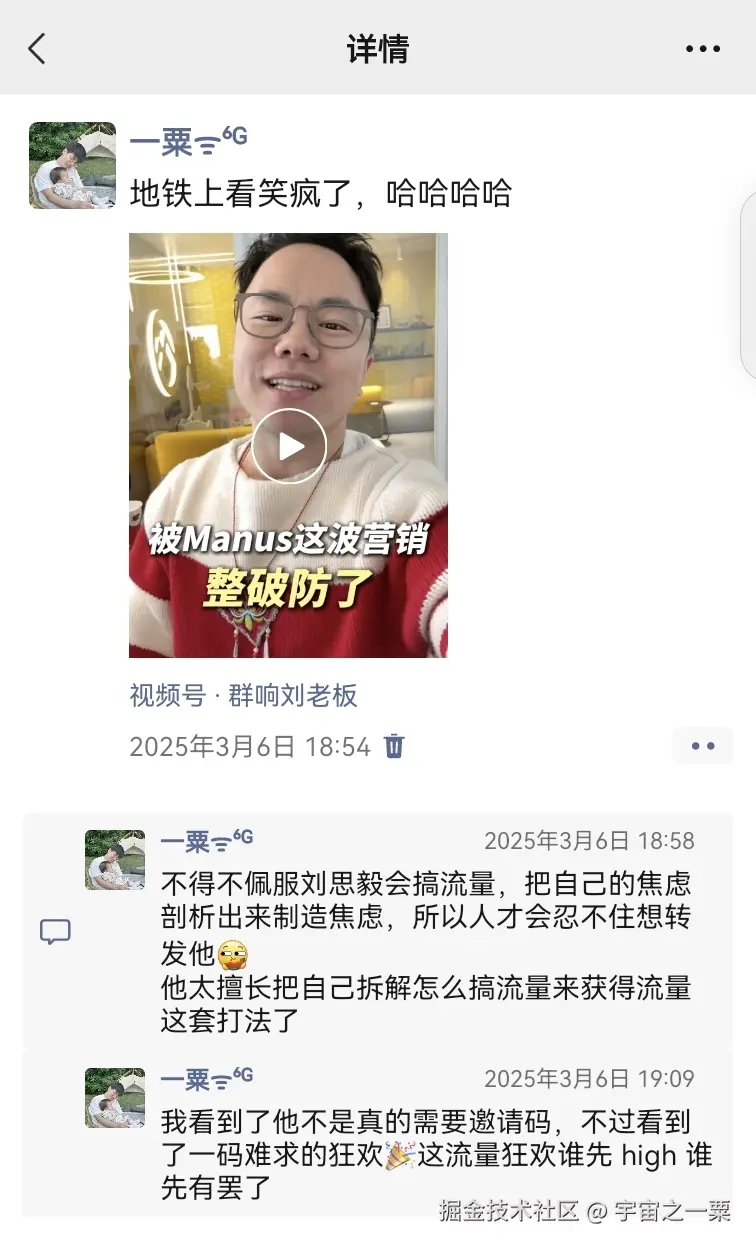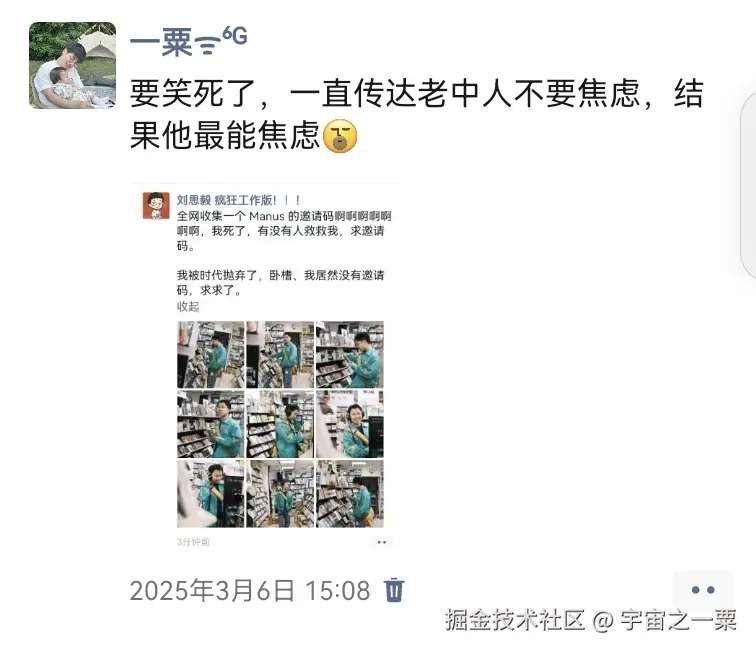 没过几分钟,我就刷到了群响刘老板——刘思毅也开始“全网收集一个 Manus 邀请码”的朋友圈,然后我又接着发了一个朋友圈,现在回想起来都觉得搞笑,哈哈哈: