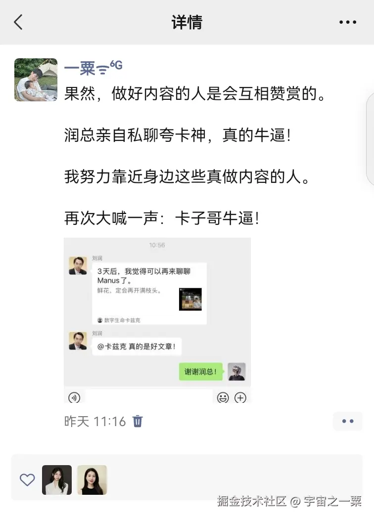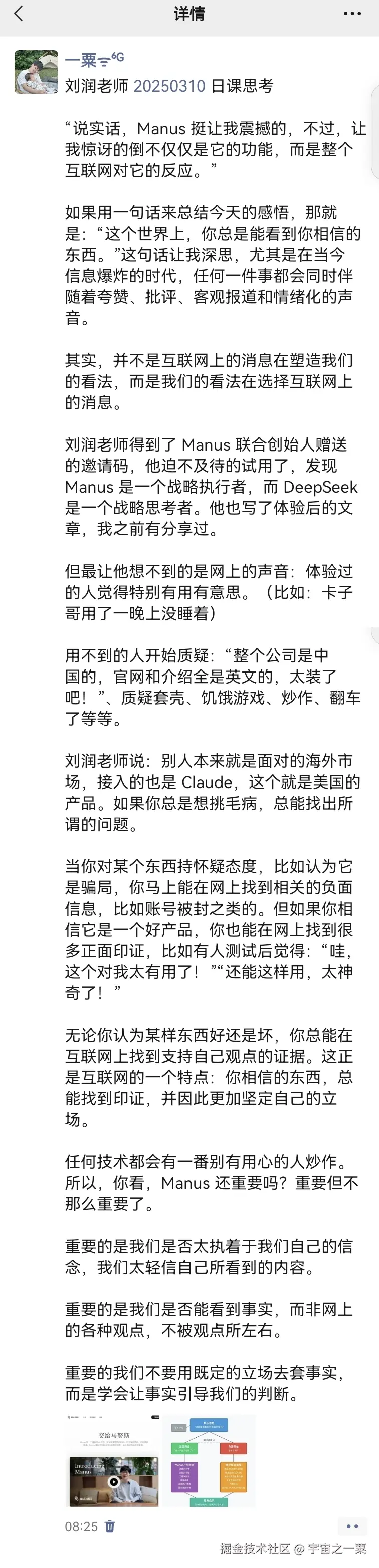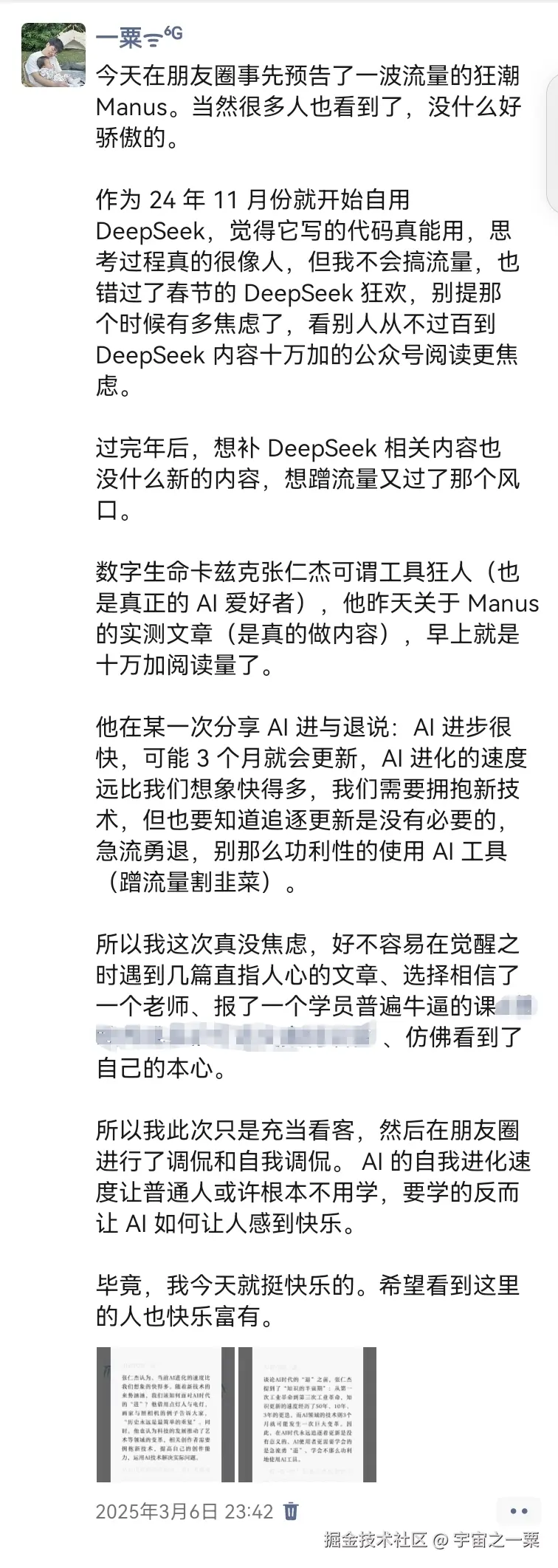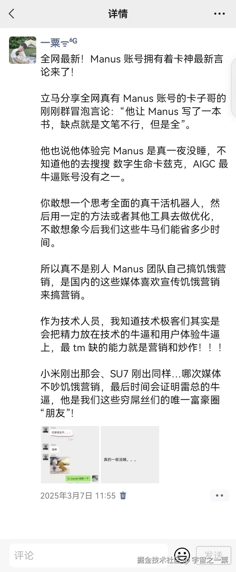 我看到网上铺天盖地的骂 Manus 团队的,趴创始人底裤的,说 Manus 套壳的,所以想说点什么,就借助卡子哥体验完一晚没睡的言论,又发了个朋友圈: