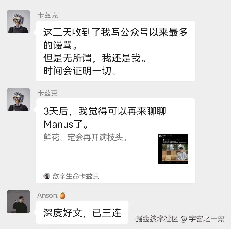 卡神发布新文章了《3天后,我觉得可以再来聊聊 Manus 了》,卡子哥说:“这三天收到了我写公众号以来最多的谩骂。”