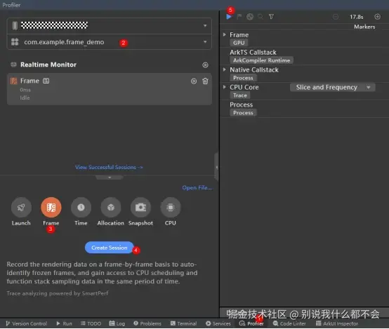 ① 打开Profiler性能分析器; ② 选择待分析的设备与应用进程; ③ 选择Frame工具; ④ 点击Create Session创建录制任务; ⑤ 准备好调试环境后,点击开始录制数据,再次点击结束录制。