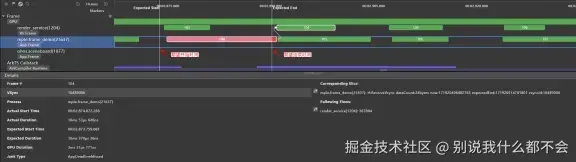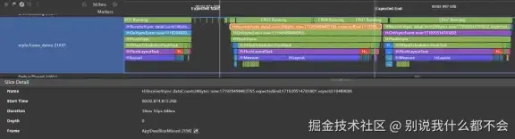 对于卡顿帧,浅红色和深红色的分界处为期望结束时间。同时针对卡顿帧,点击之后也会出现两条线,代表此帧的期望开始时间(Expected Start)和期望结束时间(Expected End)。