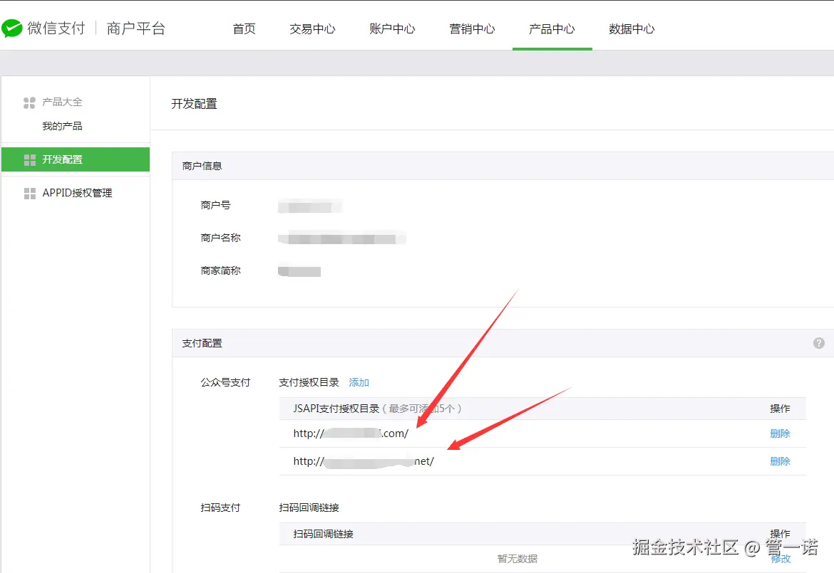 - 登录微信商户平台,进入“产品中心 - 开发配置”,配置支付授权路径。确保你调起支付的页面URL已经正确配置。