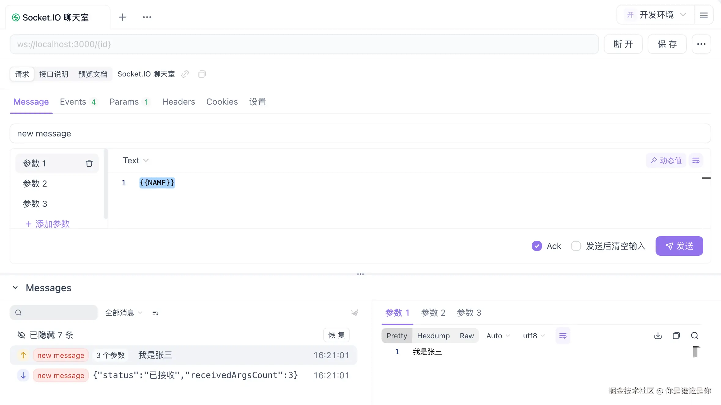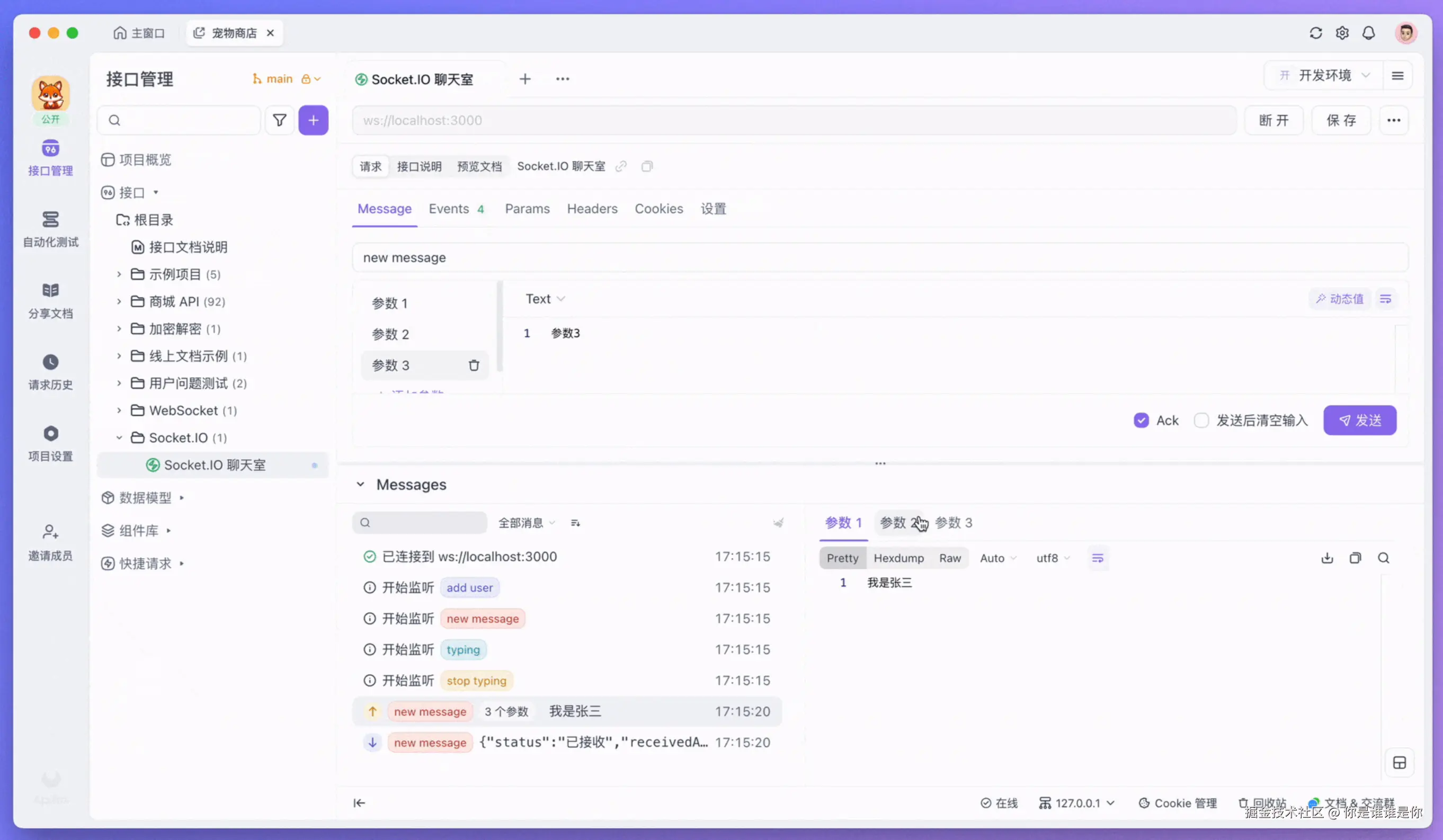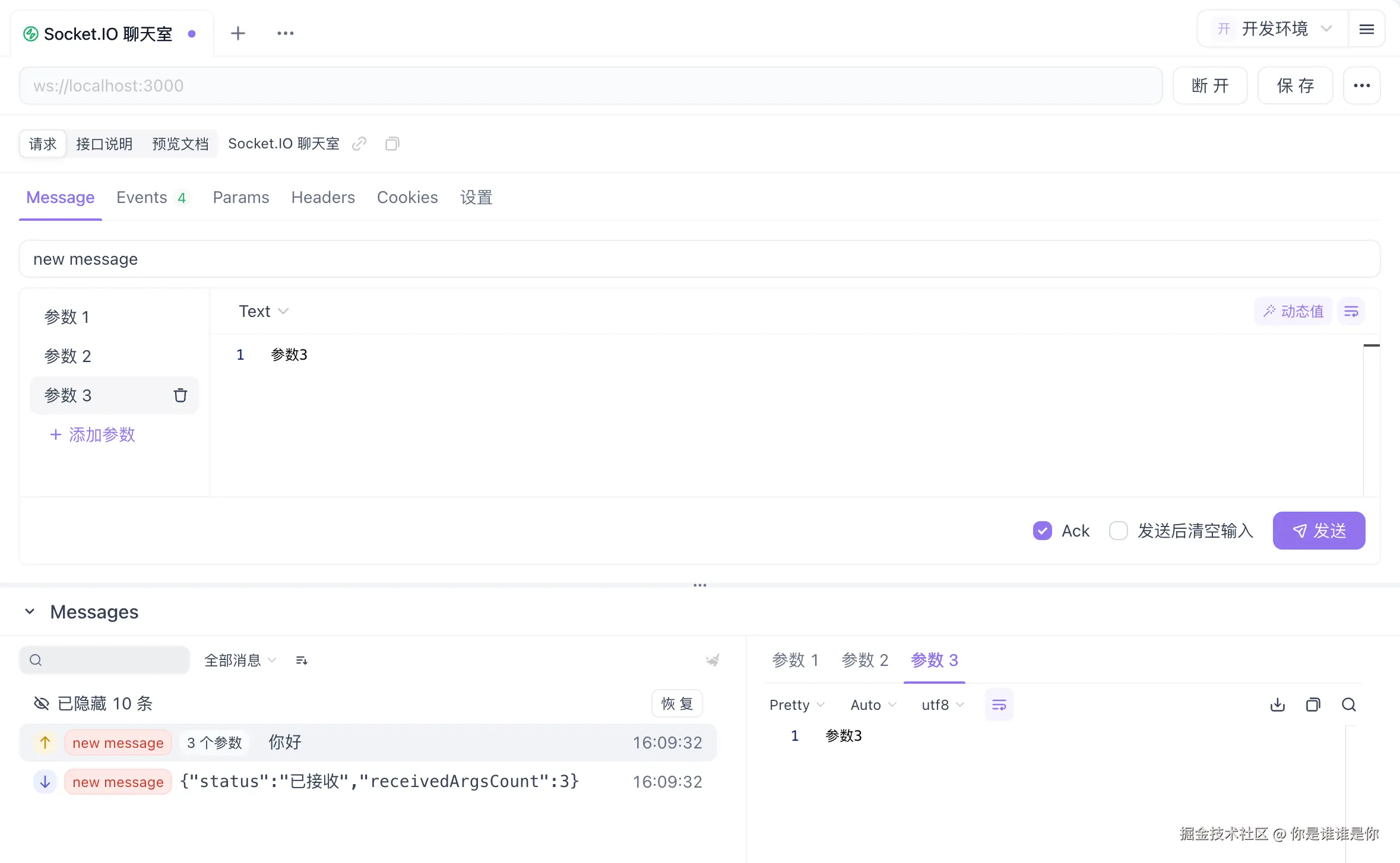 Apifox 的 Socket.IO 调试功能相当强大,你可以监听多个事件,发送不同类型的消息(包括 JSON、文本和二进制格式),还支持等待服务端的 ACK 回调。在发送消息时,你可以添加多个参数,这在复杂的 Socket.IO 调试场景中非常实用。