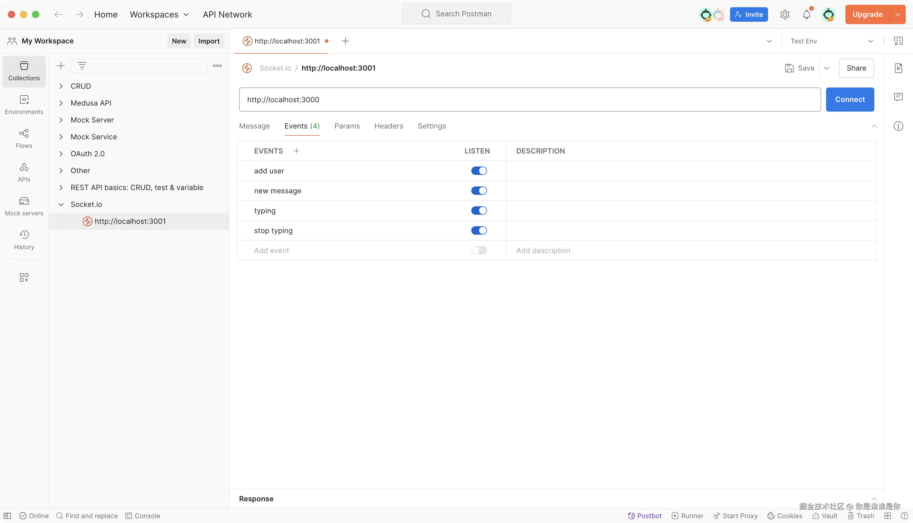 Postman 是一个广受欢迎的 API 开发工具,除了支持常规的 HTTP 请求测试外,它还提供了对 WebSocket 和 Socket.IO 的支持。作为一个成熟的 API 开发平台,Postman 在 Socket.IO 测试方面提供了专业级的功能。