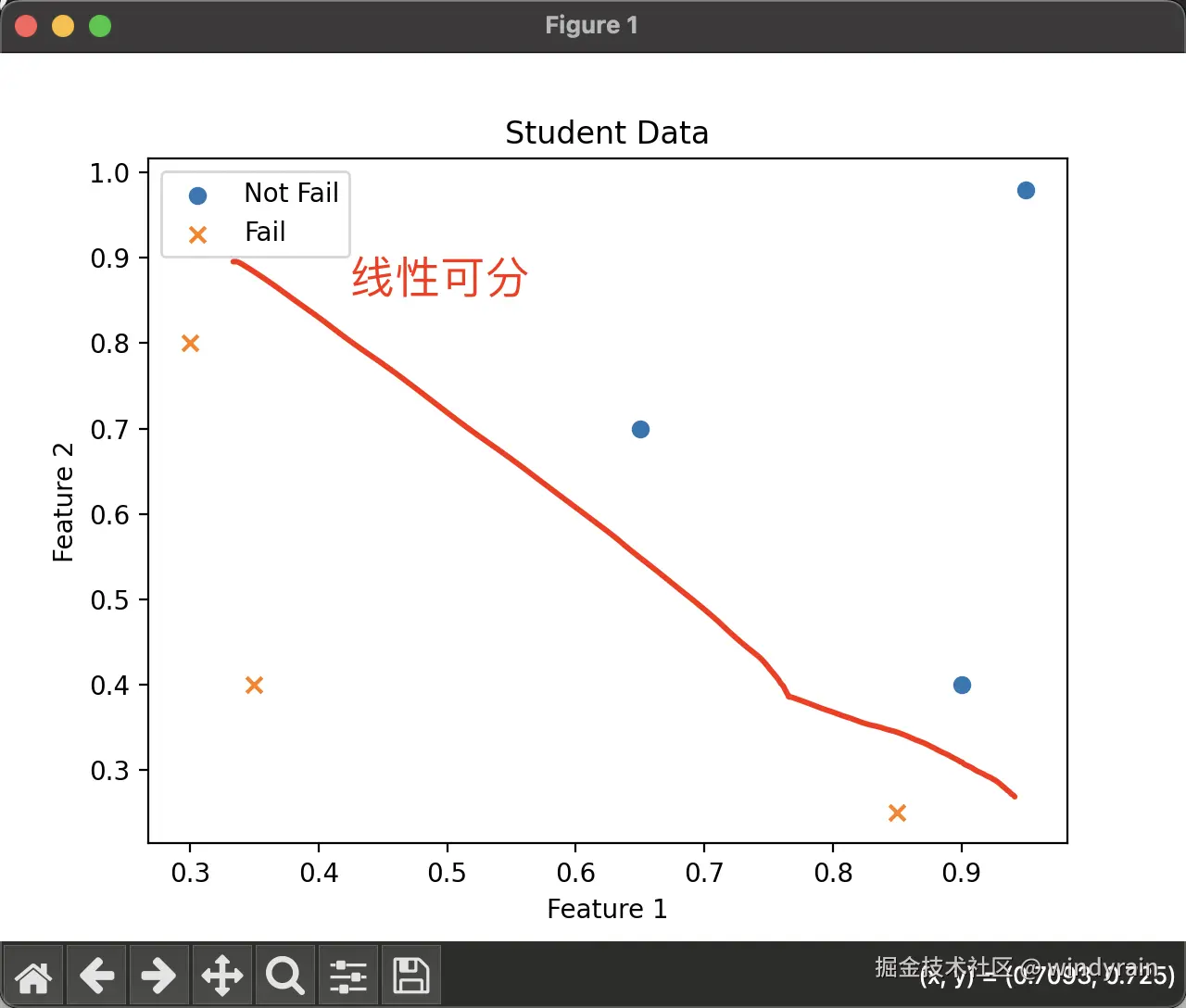 从图中可以看出,点位可以用一条线轻易的隔开,说明数据符合线性可分性