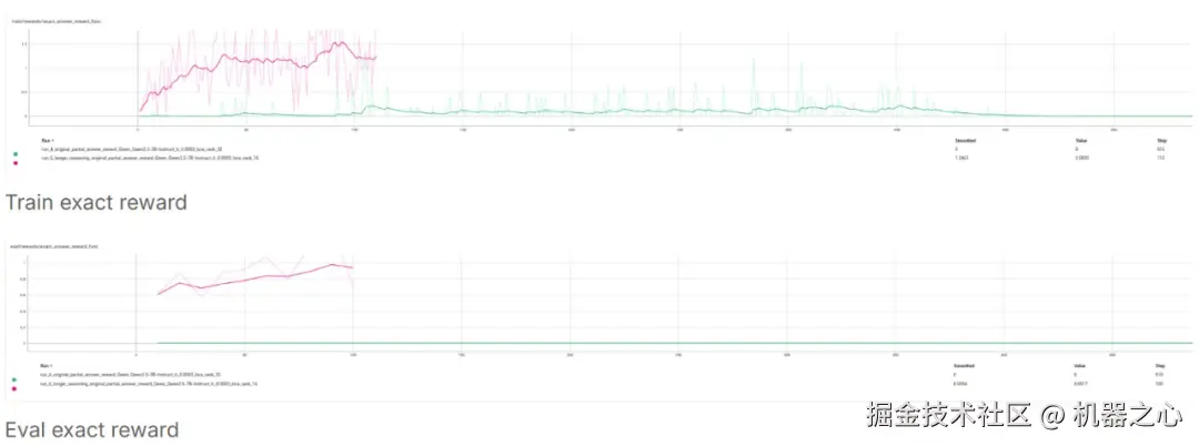 对于 7B 模型,精确答案奖励增长意味着模型能给出完全匹配的答案,但 3B 则出现崩溃情况。这证明 7B 模型学会了用很少的数据解决数独问题,并且学习速度很快!