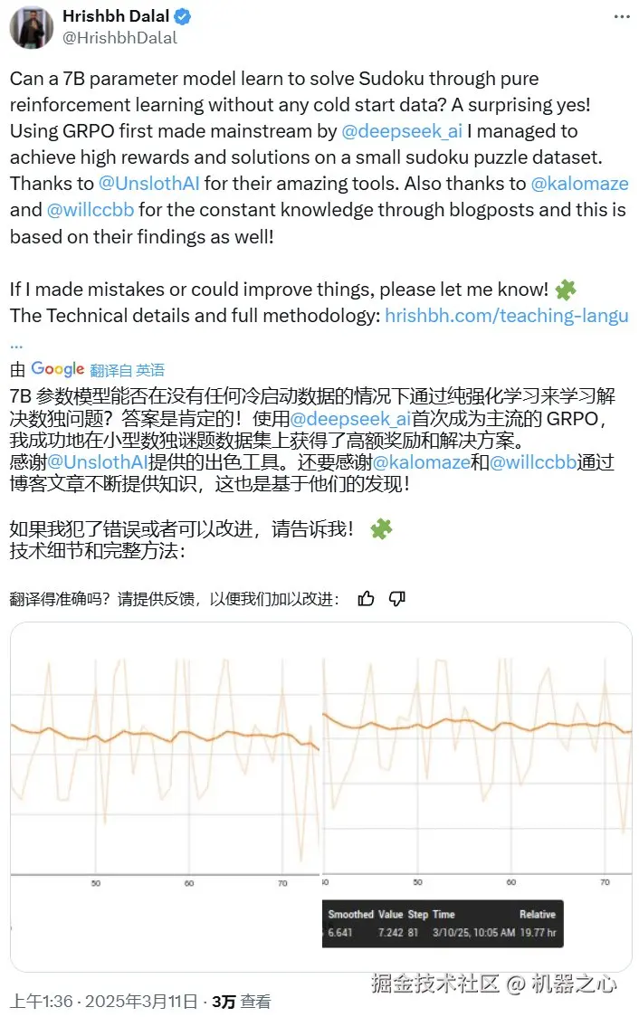 近日,技术博主 Hrishbh Dalal 的实践表明,这个问题的答案是肯定的。并且他在这个过程中用到了 DeepSeek 开发的 GRPO 算法,最终他「成功在一个小型数独数据集上实现了高奖励和解答」。